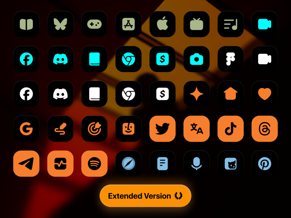 Beautiful minimal icons curated for iPhones, iPads with the deep Orange colorway plus a ton other colorways on the Extended Version.
